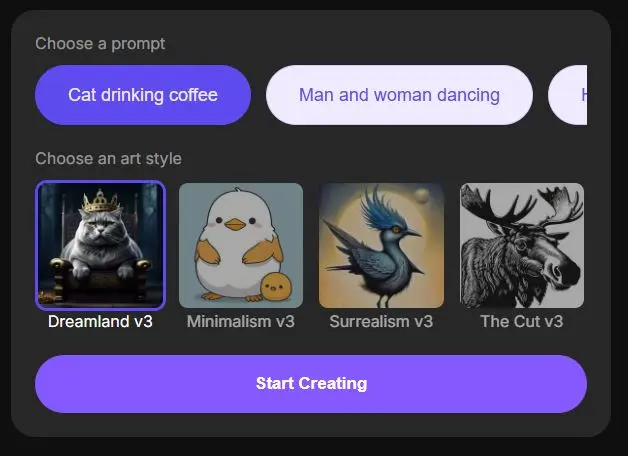 Dream (von WOMBO) ist ein KI-Tool, mit dem du aus einer Texteingabe und einer Stilwahl kreative digitale Kunstwerke erzeugen kannst. Du gibst eine Beschreibung deiner Idee ein, wählst einen Stil wie Malerei, Fantasy oder Fotografie und die KI generiert ein fertiges Bild.